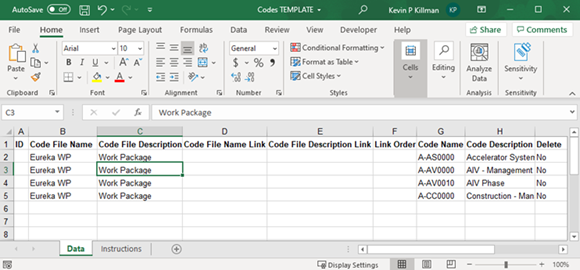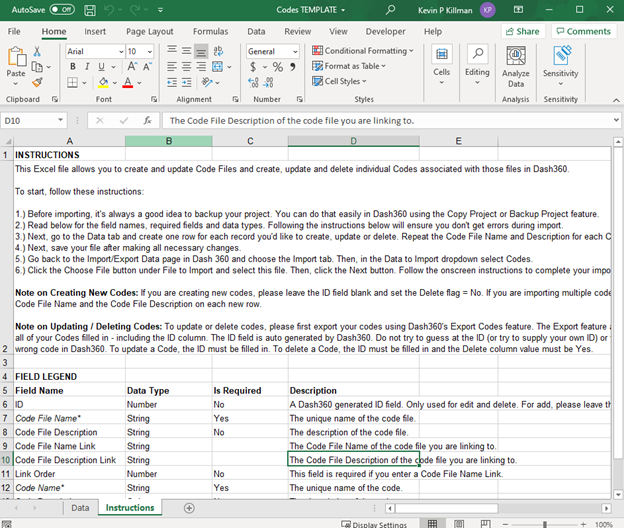 An excel spreadsheet will be downloaded with a Data sheet that provides a sample layout. Template will contain ID and Delete columns, these are used to update data in the Dash system using the import/export feature.