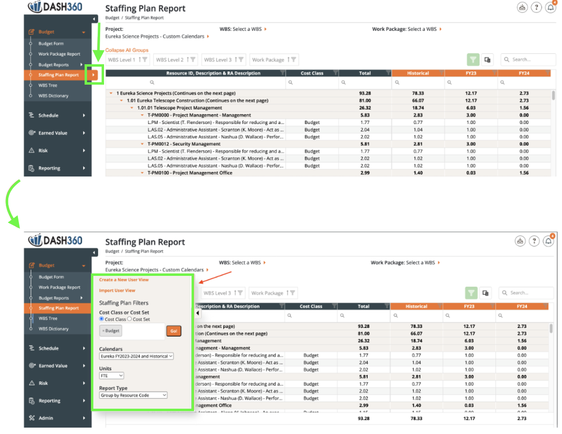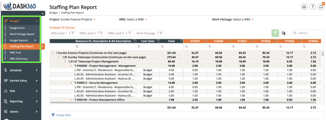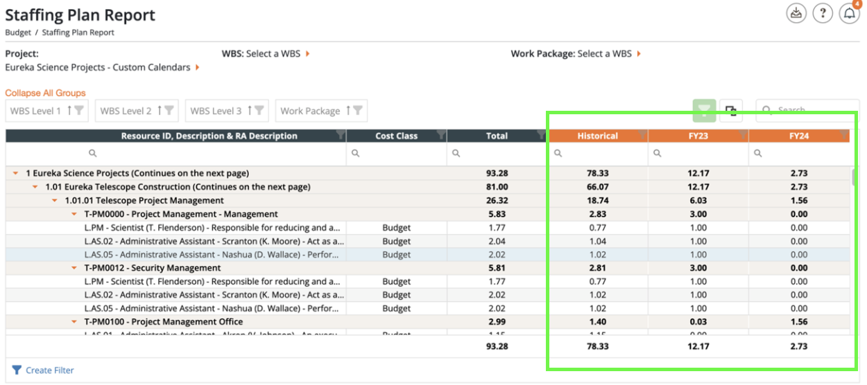 - Navigate to the Staffing Plan Report, for example, to view time-phased data in your project.