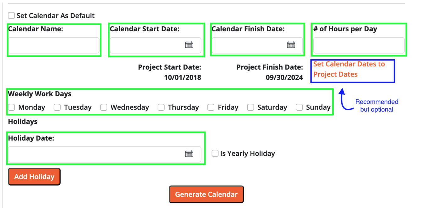 You can optionally click the Set Calendar Dates to Project Dates button to align the calendar dates with the project timeline.