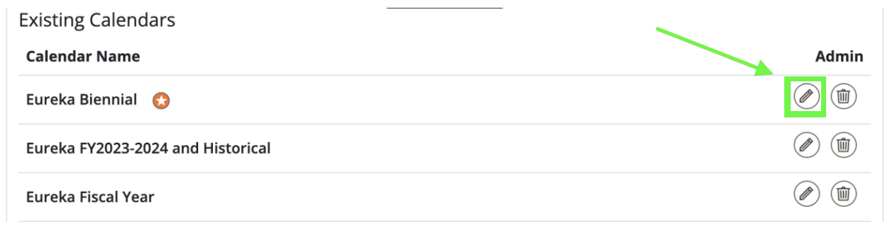 - To edit an existing calendar, click on the pencil icon next to the calendar name.