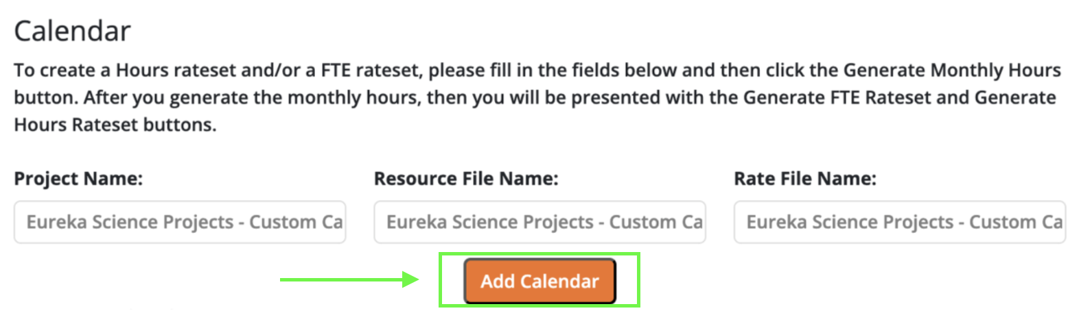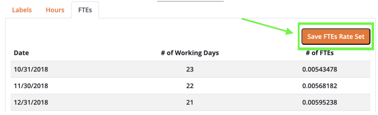 After generating the calendar, you can save the FTEs (Full-Time Equivalents) and hours as a rate set:- Click on Save FTEs Rate Set.