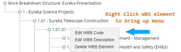 - To edit or delete a WBS Element, right click the element you wish to modify. This will bring up the menu shown below allowing the user to edit or delete the WBS element.