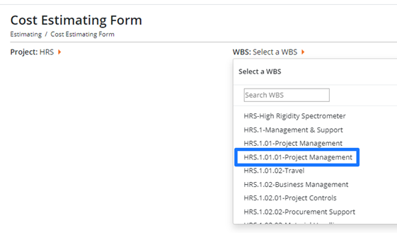 Select a WBS from the “WBS” dropdown list. You will typically want to select the lowest level WBS displayed within the desired element level as the work package will usually be at the lowest level.