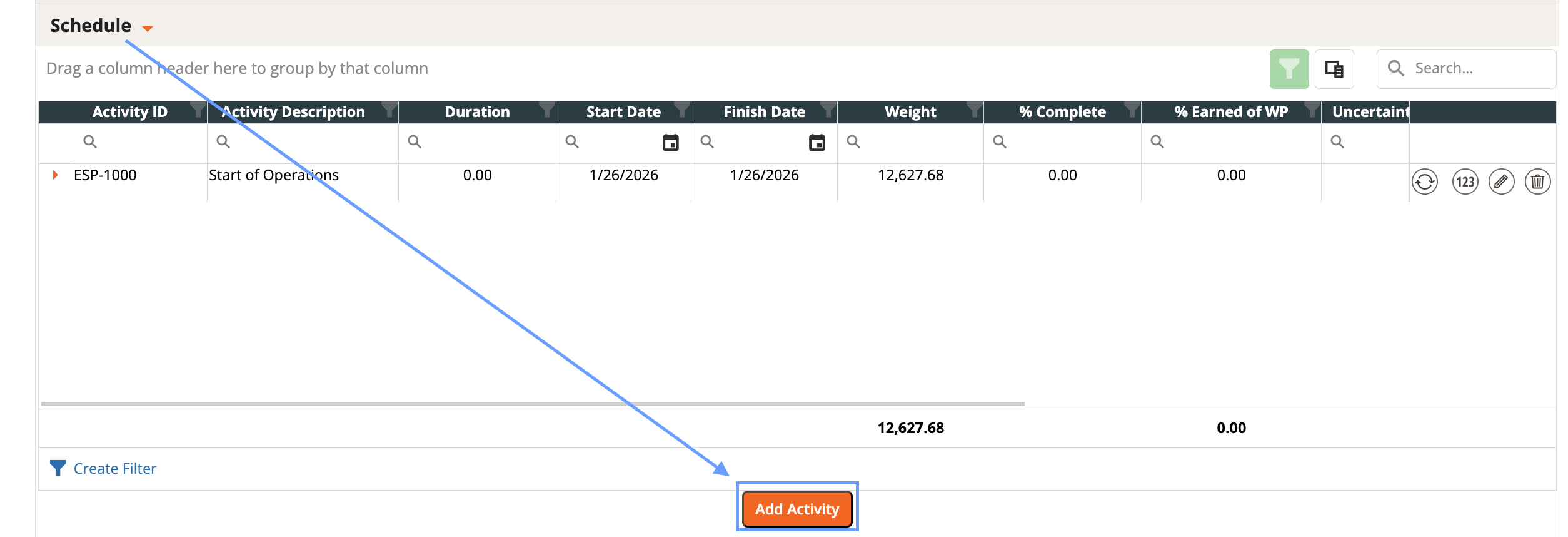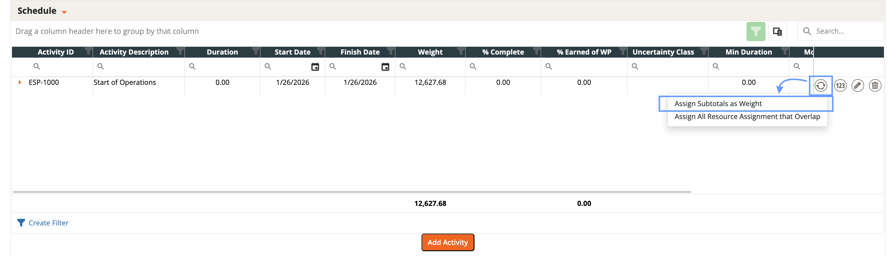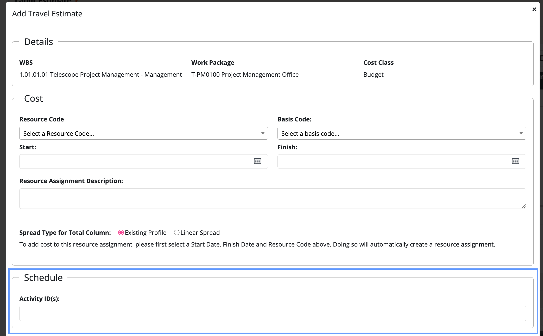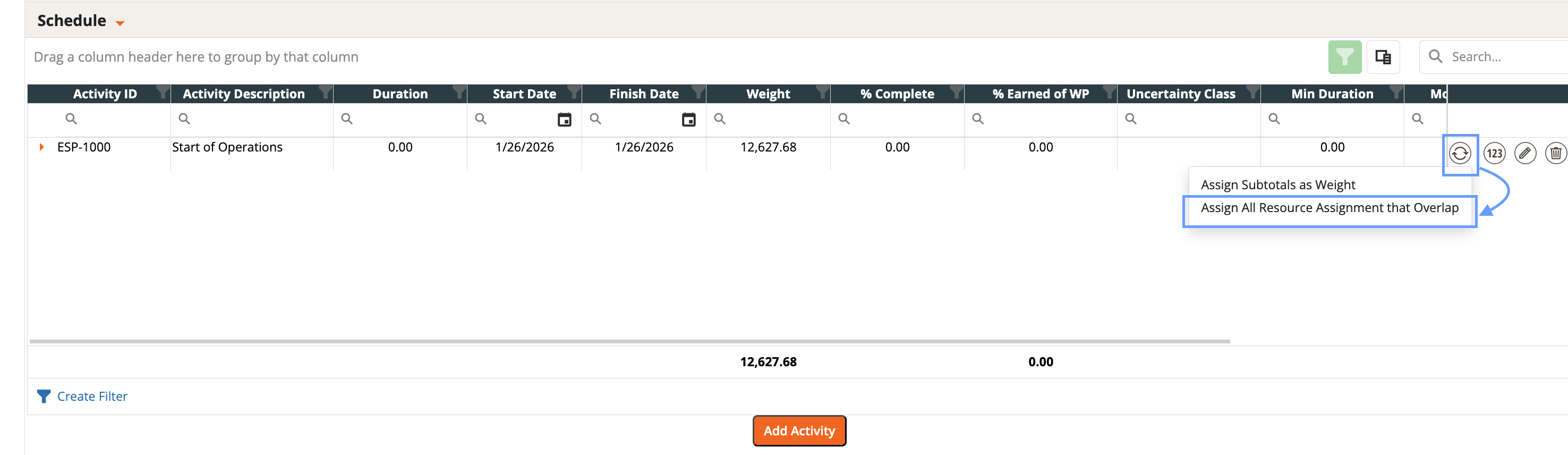 - When adding a resource assignment select an Activity ID in the schedule tab.