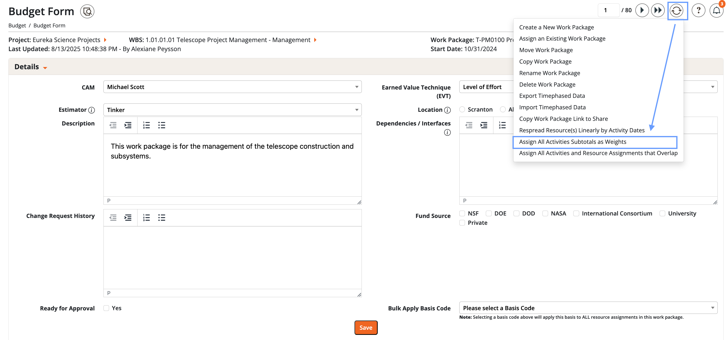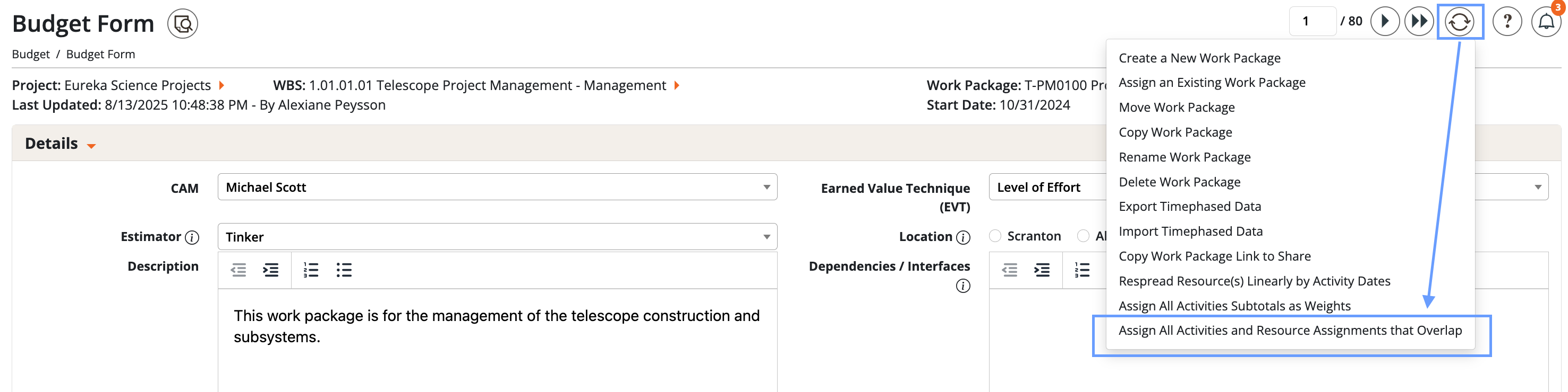 - Scope control: Most actions (Assign Overlap, Respread, Assign Weights) can run at the WP level (Budget Form process wheel) or the activity level (Labor Estimate tab process wheel).
