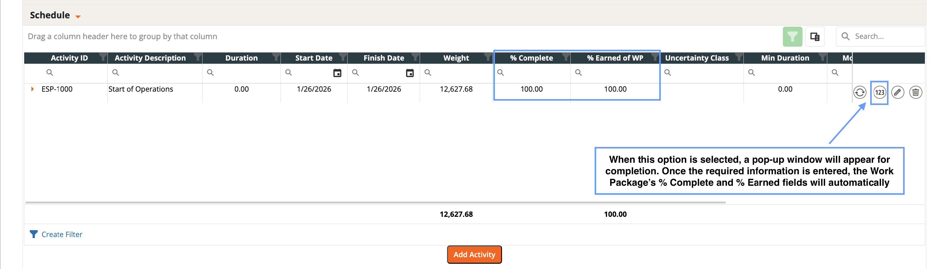 - % Earned of WP = Activity Weights * Activity % Complete