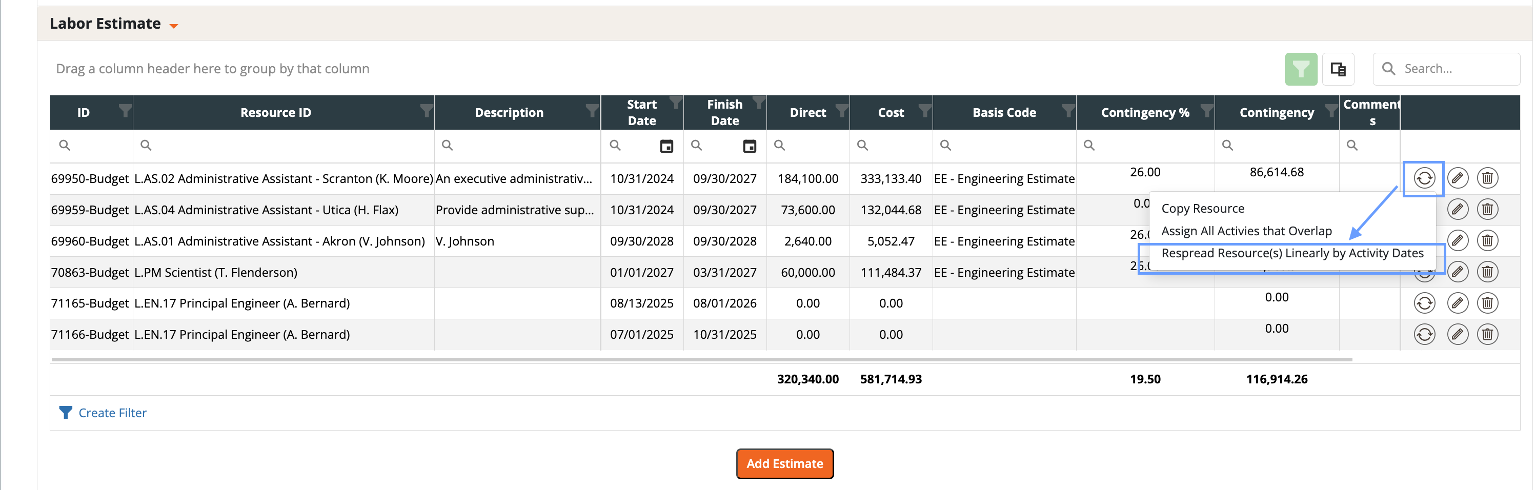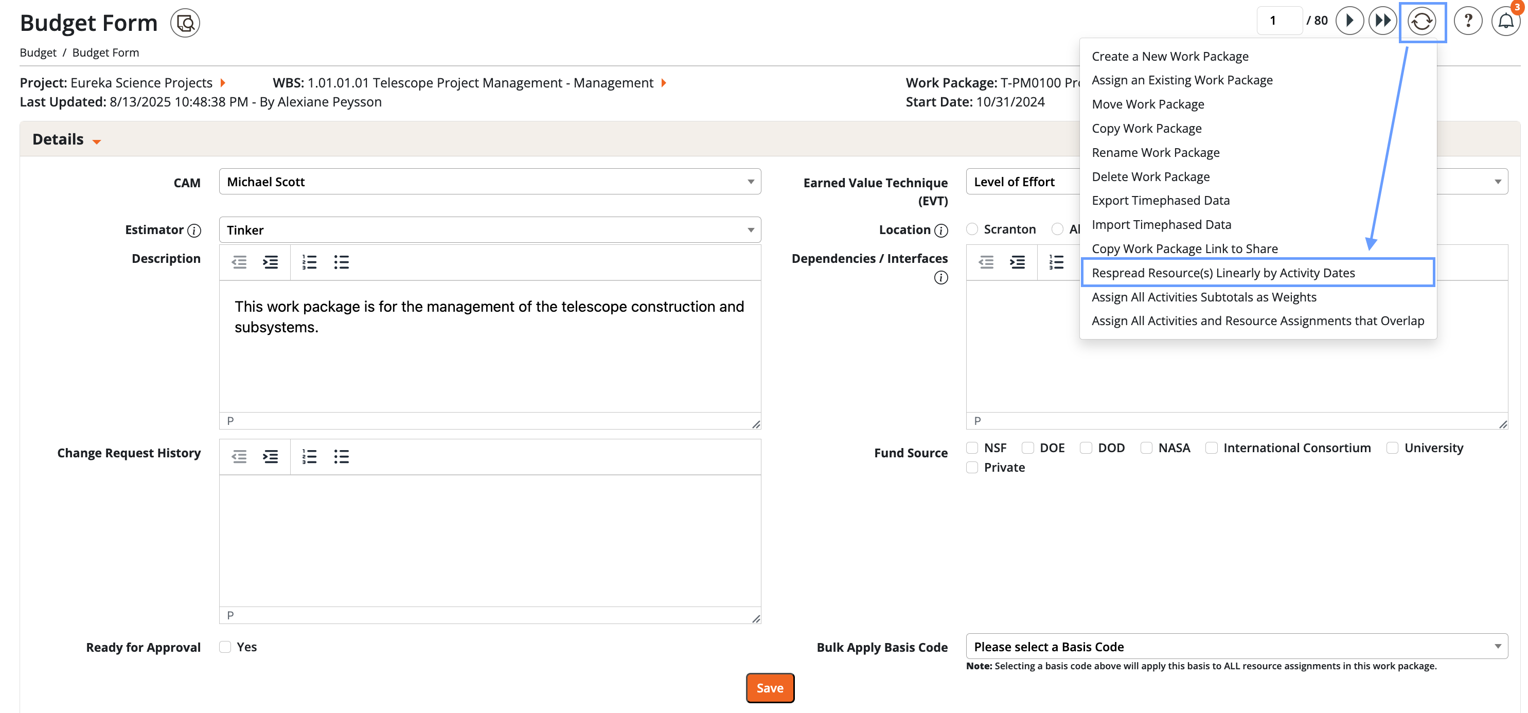 From the Budget Form process wheel, choose Respread Resources Linearly by Activity Dates. You can run this for: