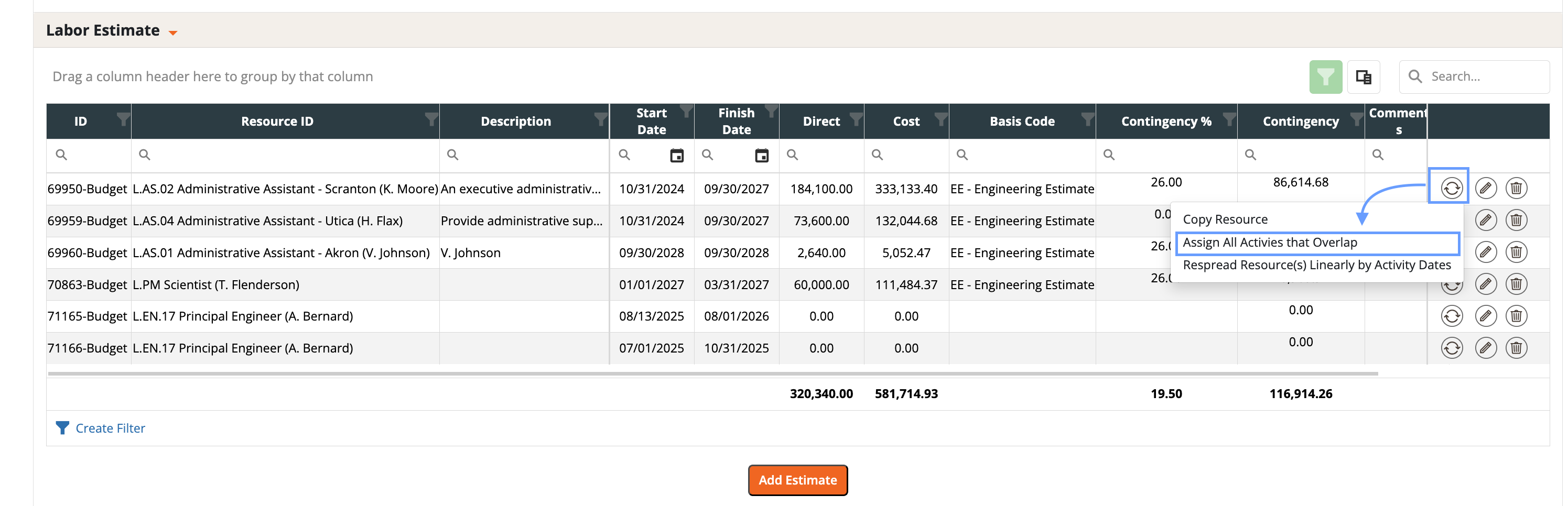 - For a single activity (Labor Estimate tab -> process wheel on that activity)