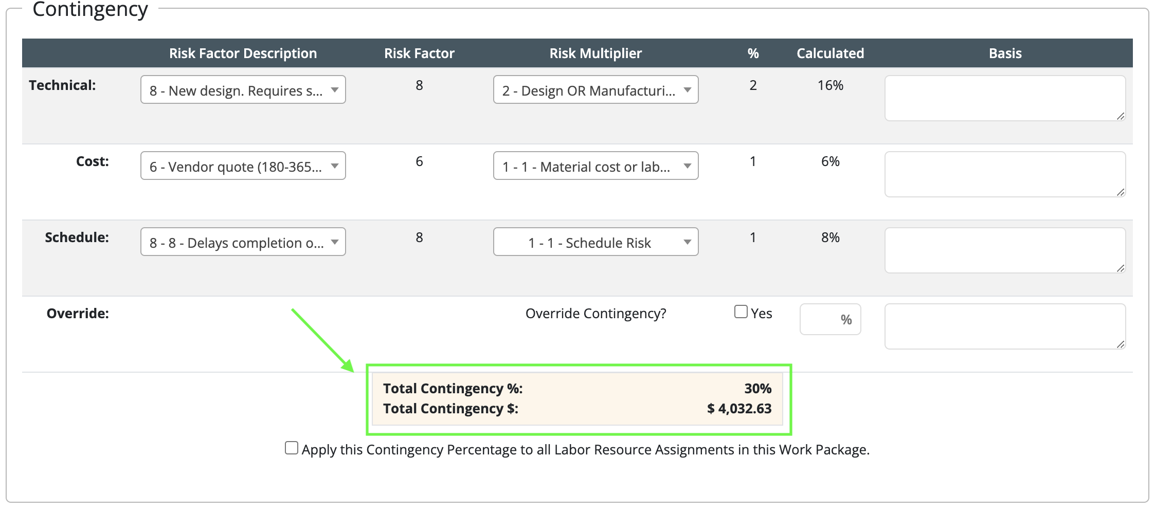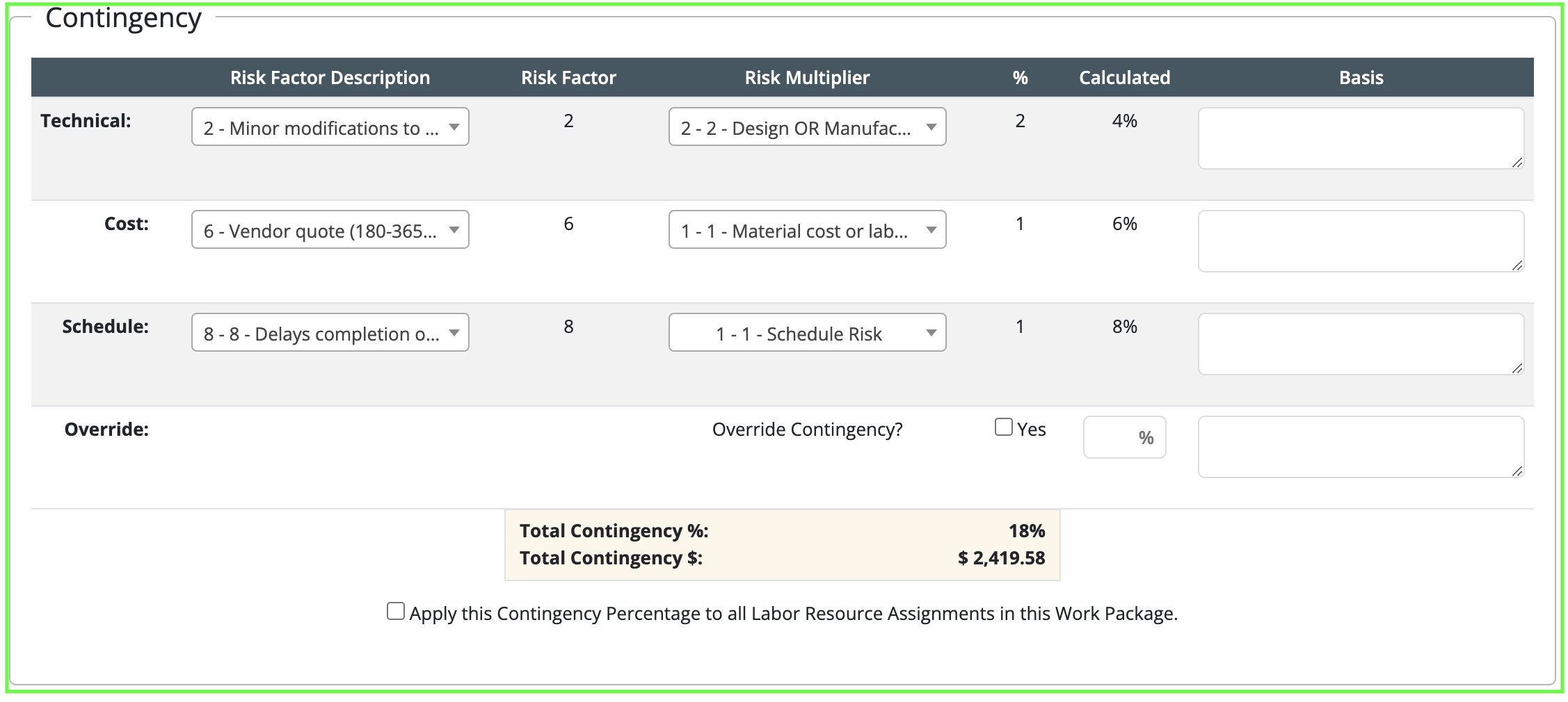 - You will supply information related to schedule, technical complexity, and cost to develop a Contingency Percentage